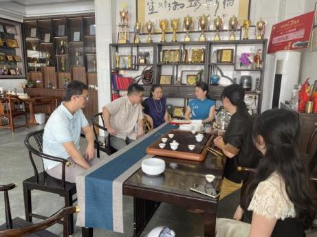 6月11日,广东乡村振兴培训学院粤东分院常务副院长张文浩博士、驻镇帮扶农村科技特派员团队陈铧耀博士与彭进明博士一行,前往潮州市潮安区凤凰县建全茶业有限公司进行实地走访,头雁计划学员展示了泡茶非遗手艺和青茶加工厂,并介绍了凤凰当地茶产业链现状。