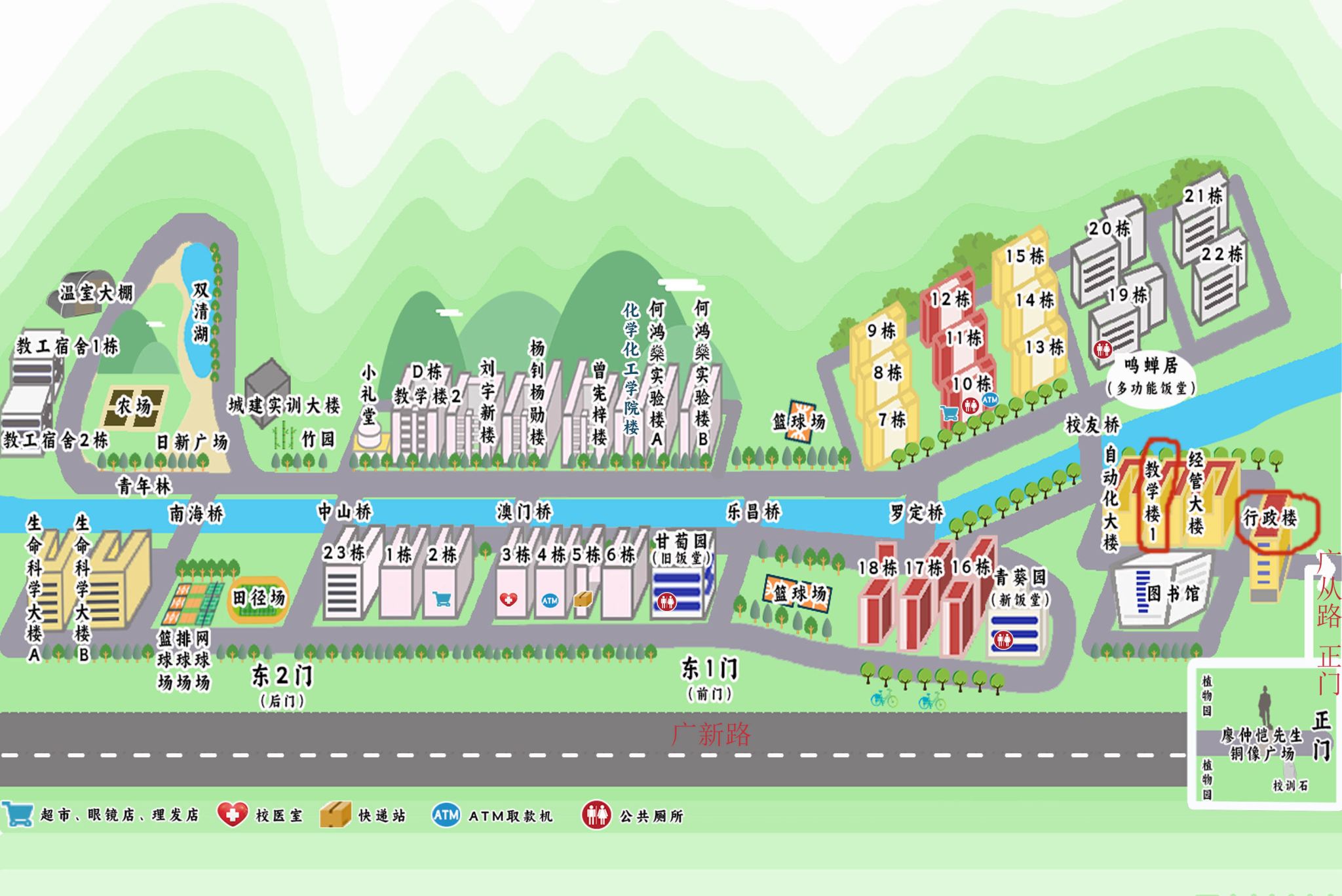 学校白云校区手绘地图及场地位置示意图(红圈建筑)