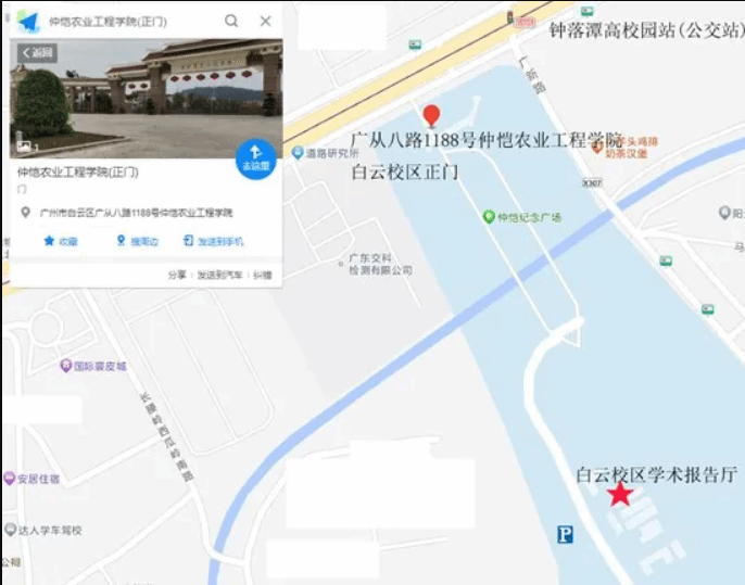 交通指引:【自驾】开车直接导航到永利y23455白云校区正门(广州市白云区广从八路1188号永利y23455),移步到学术报告厅(白云校区正门入校后主路旁第一栋建筑物行政楼一楼学术报告厅)。入校后请服从学校保卫部人员安排指引,入校车辆请停在行政楼地下停车场(电梯间在地下车库正中)或地面停车场。【公共交通】地铁钟落潭A出口,移步到钟落潭公交站坐979,乘坐7站至钟落潭高校园,步行2分钟到达目的地永利y23455(白云校区),移步到学术报告厅(白云校区正门入校后主路旁第一栋建筑物行政楼一楼学术报告厅,正门离活动场地近,请注意不要导到广新路的东门侧门)