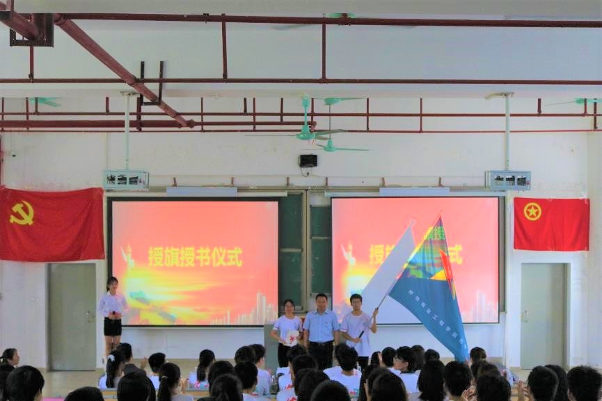 仪式在庄严团歌中拉开帷幕。在介绍青马班的历史后,由邱树华书记进行第二期“青马工程”授旗授书仪式。
