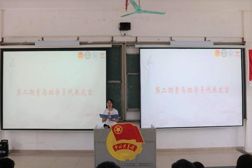 而后,由青马班学员代表龚泳诗上台发言,她代表青马班学员承诺坚定共产主义信念,坚决拥护党的领导,潜心学习马克思主义理论,学以致用,做到知行合一;学好专业知识,积极参加公益服务活动,提高实践能力和自身素质;遵守青马班的纪律,践行“注重实践,扶助农工”的校训,努力成长为一名“有理想、善学习、讲道德、要自立、勇奋斗”中国特色社会主义接班人。