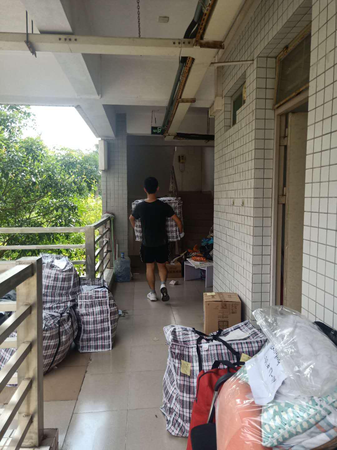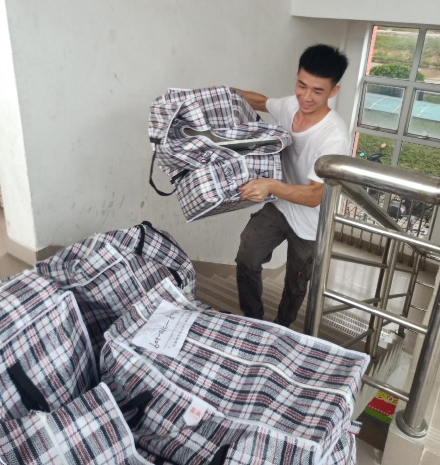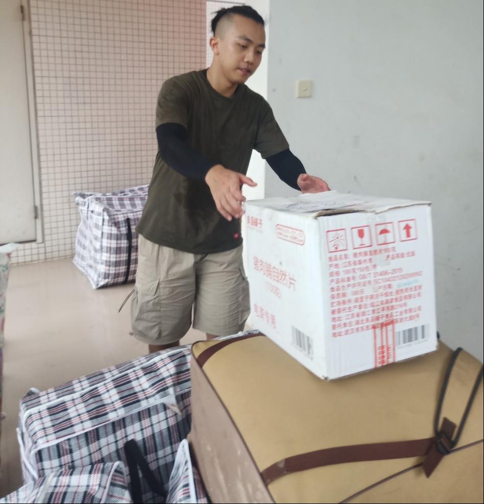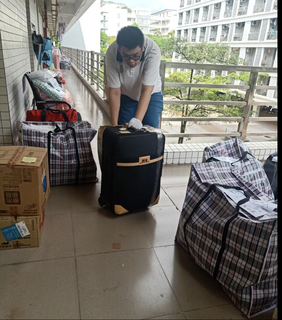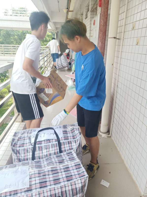 7月1日早上8点,志愿者分成打包组和搬运组,开始了有条不紊地搬迁。打包组的志愿者每人承包了5-6名同学的行李整理,他们分类归置、标注事项、粘贴标记、划区打包,每一个过程都小心谨慎、认真负责。搬迁组的志愿者成为了“流动的小红帽”,顶着骄阳,推着行李,无数次往返于1栋、10栋和17栋。志愿者们不惧酷暑,发扬不怕苦、不怕热、不怕累的精神,整的整、扫的扫、搬的搬,干的热火朝天,尽管脸上满是汗水,衣衫湿了又干,干了又湿,志愿者们丝毫没有因为天气炎热,影响他们清理、搬运的脚步,楼上楼下,校道奔忙的志愿者们组成了校园最美风景线。