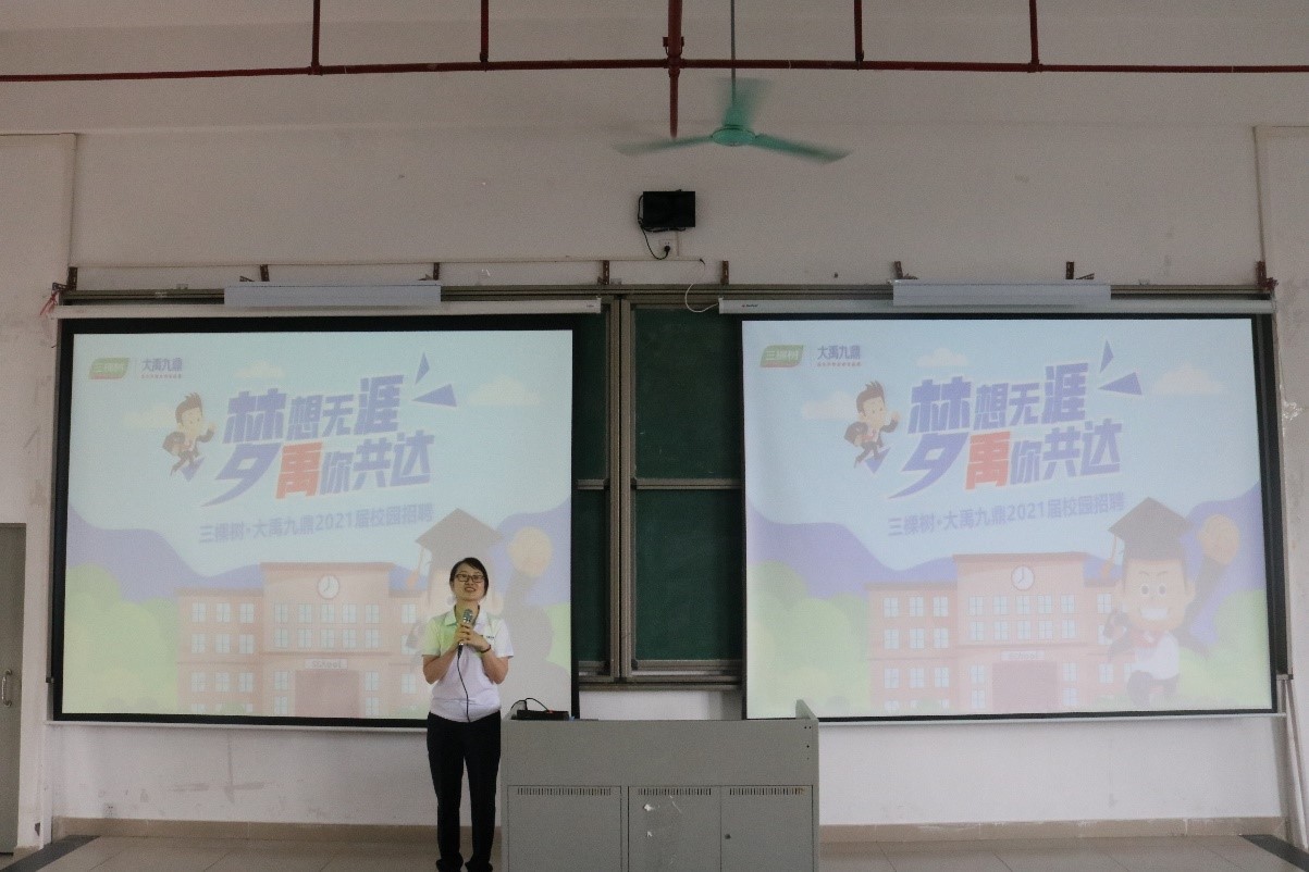 会议伊始,由三棵树大禹九鼎公司的宣讲人钟女士从公司的发展历程、主营产品、薪酬待遇以及企业荣誉等方面进行讲解。其中,她在培训方面强调道,公司人员能够通过培训从而获得提升,培训是一种福利,但其带来的成长是最大的待遇。此外,公司鼓励创新,期待创新型人才的加入。