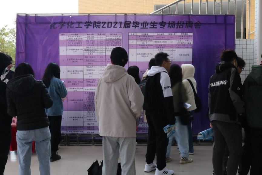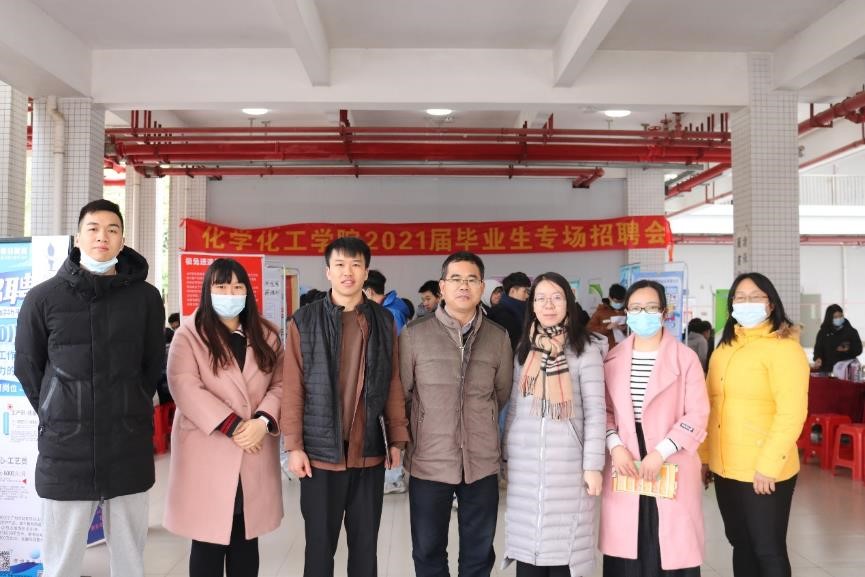 1月11日上午,化学化工学院于综合教学楼架空层举行化妆品类企业招聘会。为了更好地了解企业情况与2021届毕业生招聘情况,化学化工学院院长舒绪刚、党总支副书记严丽纯、辅导员王正梅、刘亚宁、徐冠东、李珊珊、梁开华莅临本次受聘会作详细了解。
