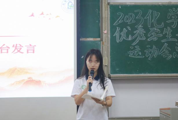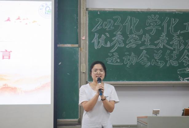 接下来是表彰先进的环节,化学化工学院领导老师刘勇、袁海儒代表学院按分类序依次交替对2023年各方面表现优秀得学生代表以及在学院参加第三十届校运会的获奖学生运动员代表进行了表彰赠礼。本次接受表彰的优秀学生代表包括:学院获得国家奖学金的林伟隆、陈嘉怡、曾东芳同学;学院获得学校一等奖奖学金的有陈鹏、陈嘉怡、林伟隆,伍德杰、吴明雪、刘露、杜家秀、何香盈、张灿凯、沈雅雯、林梦淇同学;在学科竞赛国家级决赛获奖的团队成员代表李晓妍、苏俊豪、吴雨欣、连晓璇等同学;在省级以上文体类赛事获奖的阳光体育代表梁子辕、陈泽强、李汶谦等同学;学院在校运会获得第二名的参赛运动员代表廖翠莹、陈继豪等同学。