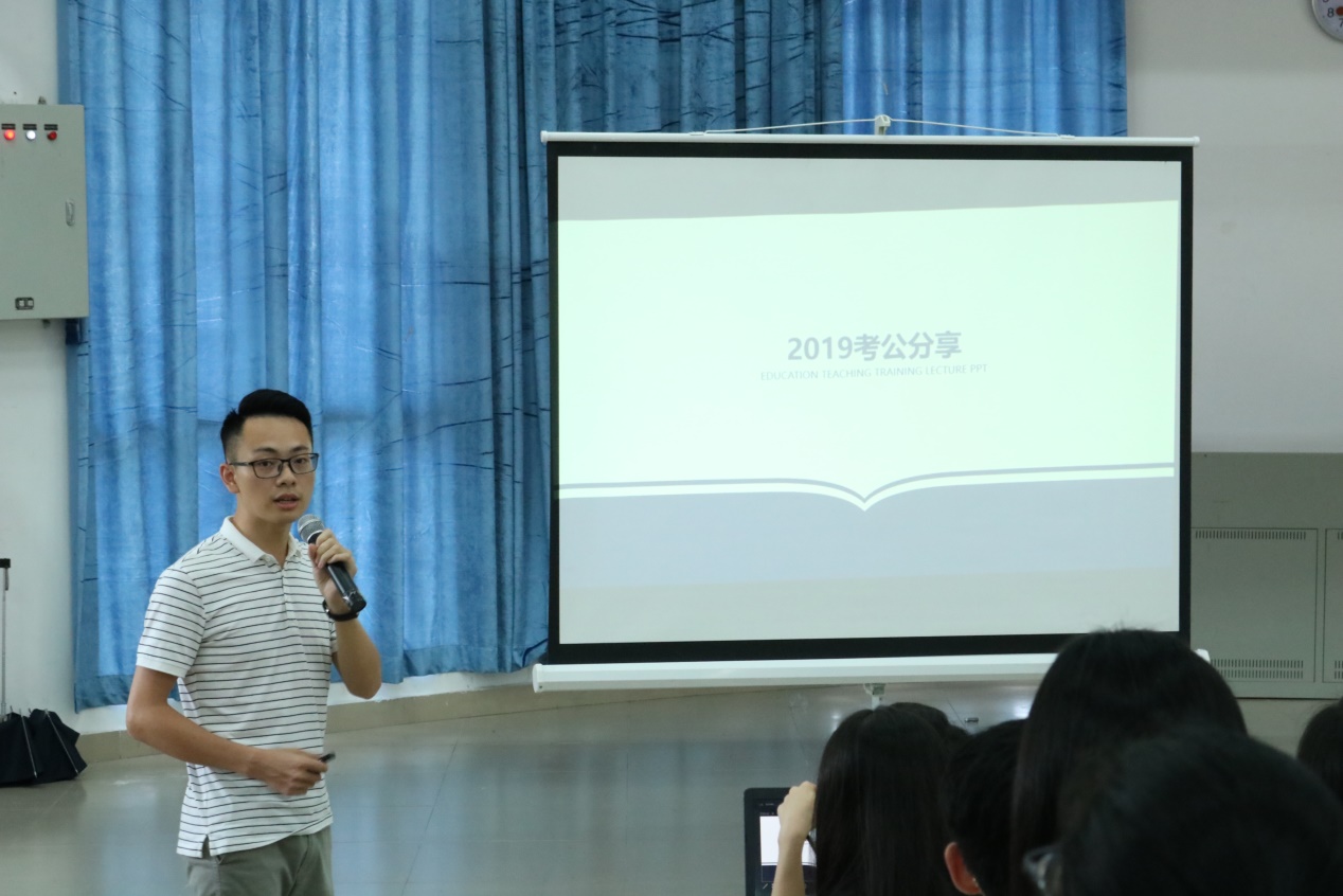 最后,由朱桃源给同学们讲解考公务员的相关事宜。他提到,考得公务员后,不仅工作稳定有保障,而且能够更好地为社会服务,因此考公务员不失为大学生的一个不错的选择。同时,针对富有难度的考公务员之路,他为同学们进行了说明,并给出了自己的建议。他提到,考公之路应要有决心、有自信并且要提前做好准备,利用好学习工具,坚定地执行自己所制定的学习计划,同时不能轻视考公务员过程中的任何一场考试。在每场考试前都要了解、熟悉考场及周边情况,遵守考场规则及秩序。