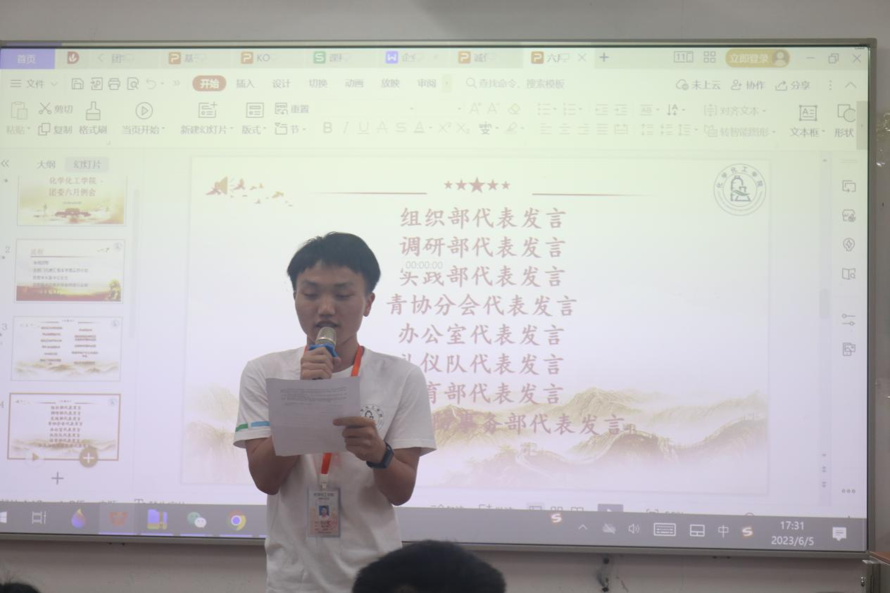 6月5日,化学化工学院于白云校区杨钊杨勋楼510课室召开团委六月例会。出席本次会议的有化学化工学院团委副书记梁开华以及团委全体成员。