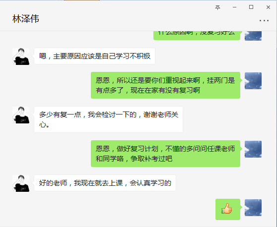 对学业有困难的学生,特别是上学期存在挂科的学生也采取了一系列的帮扶措施。各年级辅导员和班主任不仅采用线上逐个约谈的方式对每个同学挂科的原因进行了解,鼓励他们积极备战补考,而且还从认知、诚信、感恩等方面帮助挂科学生端正学习态度,珍惜学习时光,把握补考机会。此外,为帮助挂科学生顺利补考,各班级成立了线上 “一对一”学业帮扶小组,利用课余时间,为学业困难学子答疑解难,营造良好学习氛围。