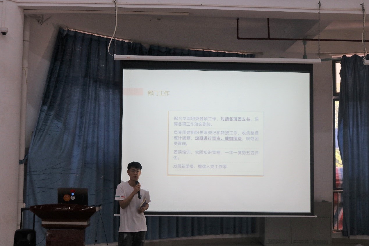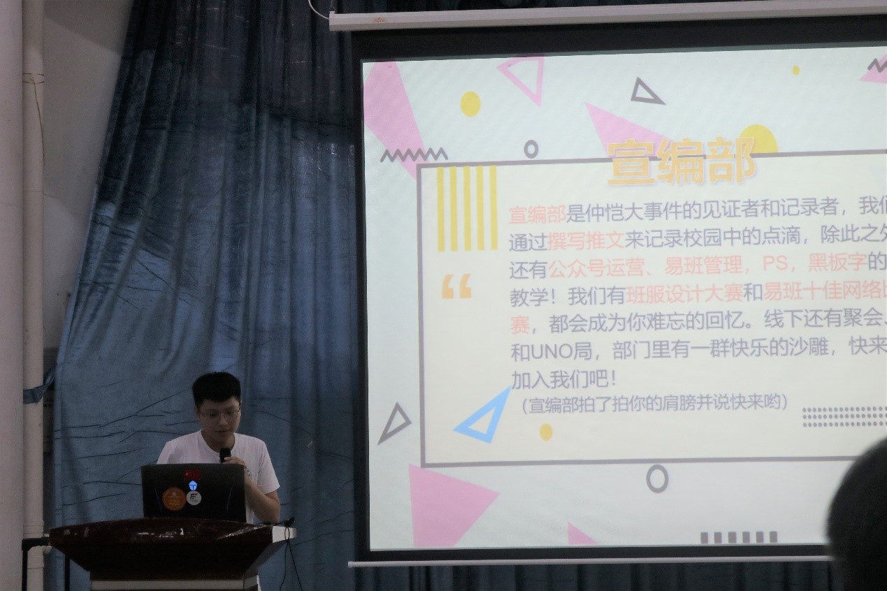随着嘉宾和20级新生们共同观看了化学化工学院三大机构的宣传视频后,团委第一副书记李伟健、学生会执行主席汤镇源和新闻中心主任黄炜岚一一发言,他们以幽默的语言,生动的讲述了各部门的职能,让新生们进一步地了解各机构所属部门,以便新生在之后部门招新做出自己心仪的选择。