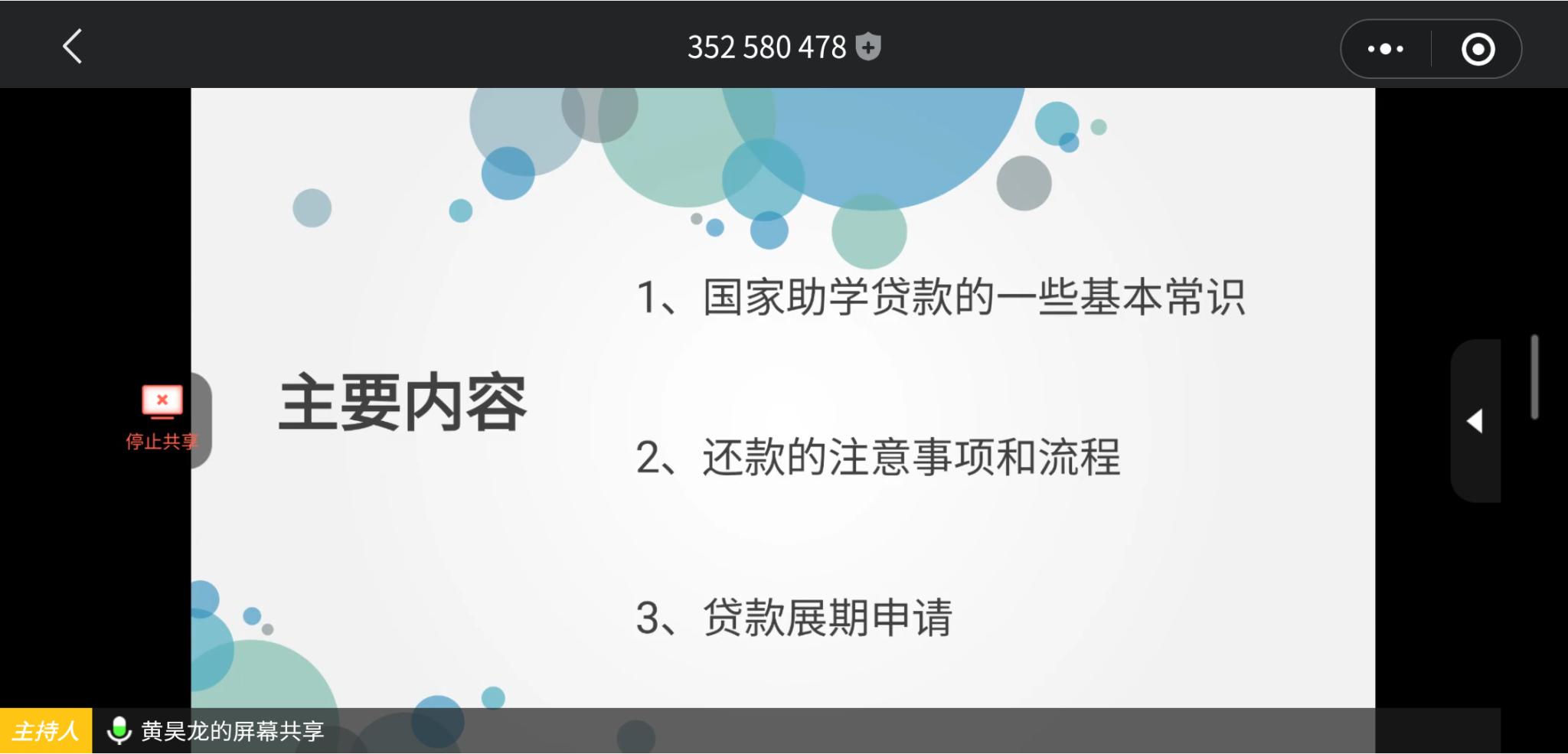 首先,黄昊龙向大家详细讲解了国家助学贷款的基本常识、注意事项和流程以及贷款展期申请,同时提醒校园贷款的同学要牢记自己的账号和密码,按时还款,以免影响个人征信。