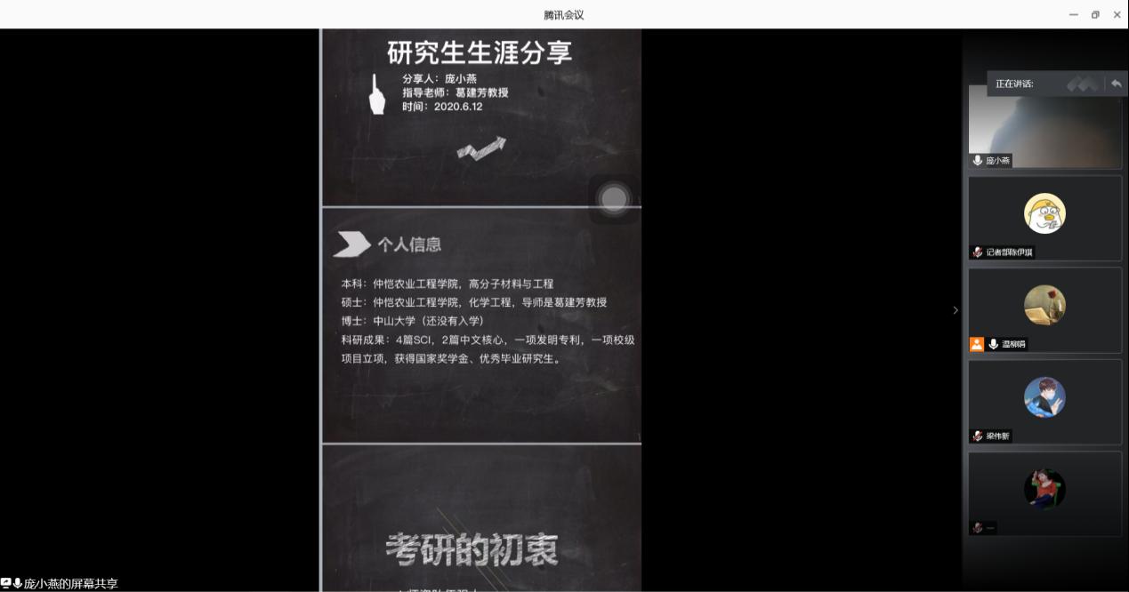 随后,由我院优秀硕士毕业生庞小燕同学进行研究生生涯分享。庞小燕通过“故天将降大任于斯人也,必先苦其心志,劳其筋骨,饿其体肤,空乏其身,行拂乱其所为,所以动心忍性,曾益其所不能”这句话勉励17级学子积极备考,并祝愿考研的同学们的付出都有收获。