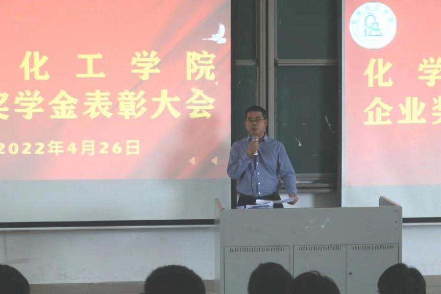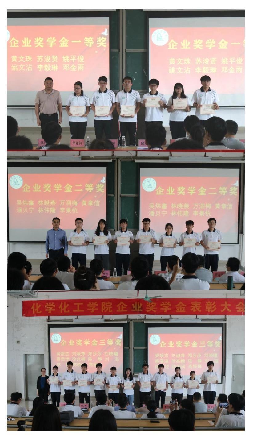 紧接着各位领导为获奖同学进行颁奖。由党委书记邱树华为获得企业奖学金一等奖的同学颁奖;院长舒绪刚为获得企业奖学金二等奖的同学颁奖;党委副书记严丽纯和高分子与材料系系主任周向阳为获得企业奖学金三等奖的同学颁奖;应用化学系系主任程杏安和化学工程与工艺系系主任张步宁为获得企业技能竞赛奖励金的同学颁奖;应用化学系系副主任杨富杰为获得班级奖学金的同学颁奖。