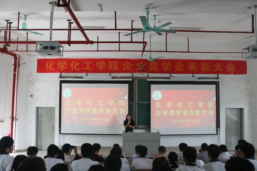 4月26日中午,化学化工学院于白云校区D2小礼堂举办了企业奖学金表彰大会。出席本次表彰大会的有化学化工学院党委书记邱树华,院长舒绪刚,党委副书记严丽纯,化学工程与工艺系系主任张步宁,高分子与材料系系主任周向阳,应用化学系系主任程杏安、副主任杨富杰,辅导员刘亚宁、李珊珊、梁开华、蔡惠容,企业奖学金获奖同学以及高分子材料与工程211、212、213班,化学工程与工艺213班。