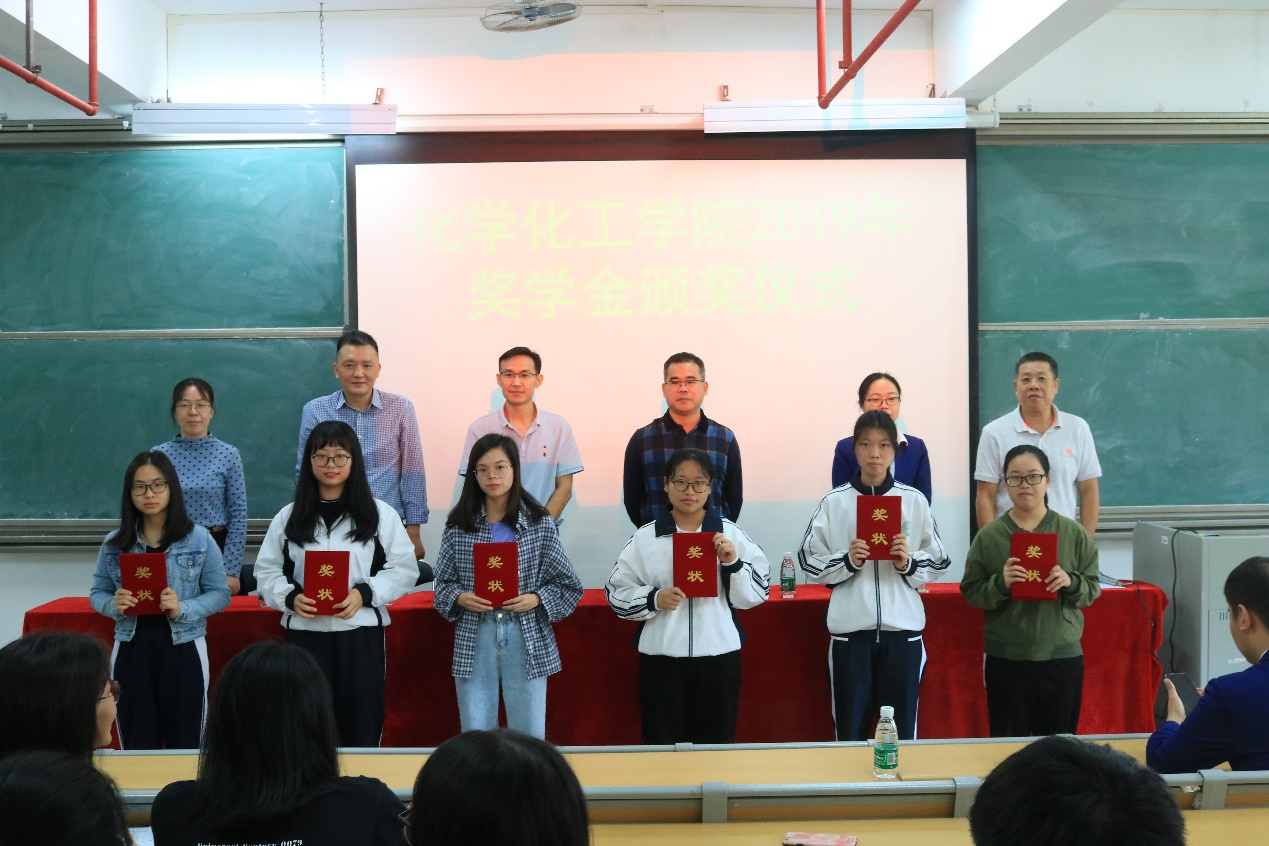 11月12日上午,化学化工学院2019年奖学金颁奖仪式于综合教学楼310课室隆重举行。莅临本次会议的嘉宾有化学化工学院院长舒绪刚、党总支副书记严丽纯、副院长冯光炷、高分子材料系主任周向阳、江门市九冠松新材料科技有限公司总经理王伟松、广东丽亨化学复合材料科技股份有限公司人事部总经理周凤以及各年级获奖学生代表。本次会议共五项议程。