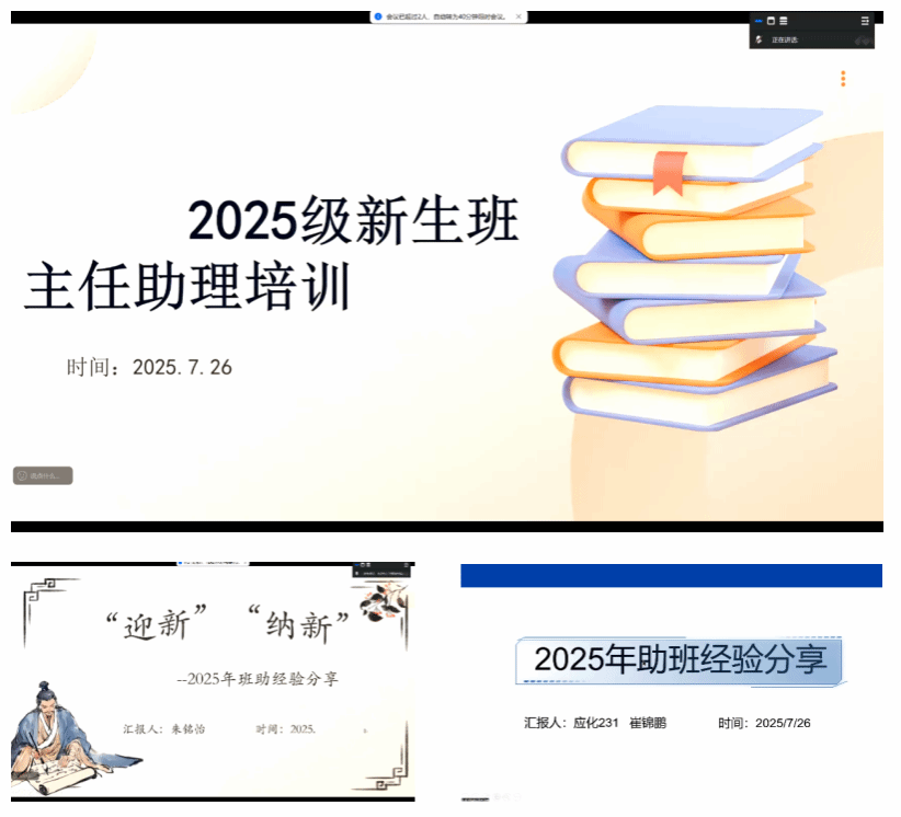 本报讯(化学化工学院 洪志丹)为全面提升新生班主任助理履职能力,保障2025级迎新工作高效开展,化学化工学院于7月26日线上召开新生助班专题培训培训由辅导员助理洪志丹主持,辅导员李珊珊老师、往届优秀班主任助理代表朱铭怡、崔锦鹏及全体新生班主任助理参加
