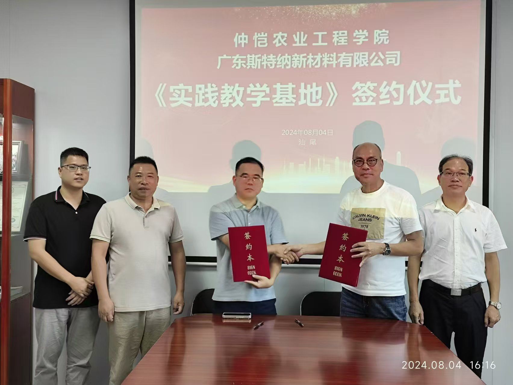 化学化工学院院长舒绪刚与广东斯特纲新材料有限公司董事长签署合作协议书,学院党委书记邱树华、材化系主任廖松义、汕尾市科技局陈明舜科长受邀参加签约、揭牌仪式。